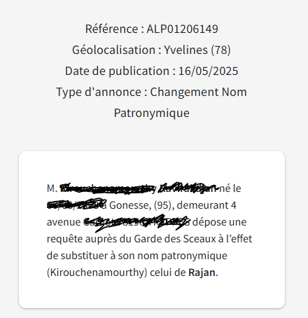 Il est à noter que si le demandeur demeure en France, une publication est, en outre, effectuée dans un journal désigné pour les annonces légales de l'arrondissement où il réside (article 3 1 du décret du 20 janvier 1994).